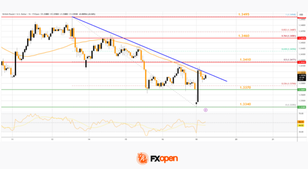 • There is a key bearish trend line forming with resistance at 1.3400 on the hourly chart of GBP/USD at FXOpen.