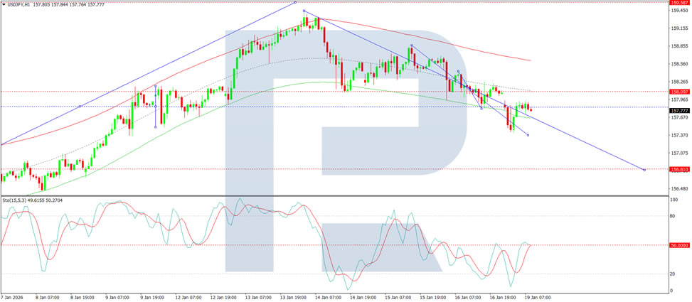 On the H1 chart, a downward wave towards 157.36 is forming, with a possible correction to 158.10 before another decline to 156.81. This scenario is confirmed by the Stochastic oscillator, which shows the signal line descending towards the 20 level.