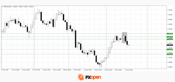 Last week, USD/CAD buyers failed to overcome the key resistance zone at 1.3900–1.3930. Technical analysis points to the potential for a decline towards the 1.3750–1.3790 area, as a bearish engulfing pattern has formed on the daily chart.