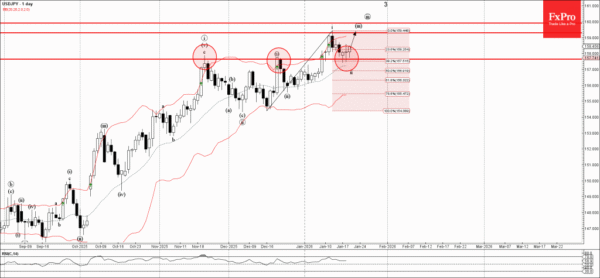 USDJPY currency pair recently reversed up from the support area between the support level 157.75 (former strong resistance from November and October) and the 38.2% Fibonacci correction of the upward impulse from December.