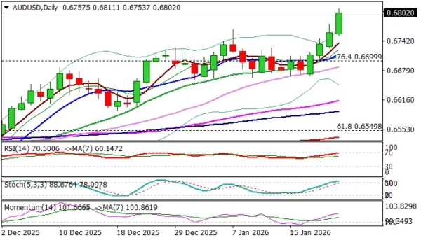 The Aussie dollar was inflated by weaker US dollar on the recent rally into safety of precious metals, following escalation of conflict between the US and EU over Greenland, while upbeat Australia’s December labor report further lifted the currency.