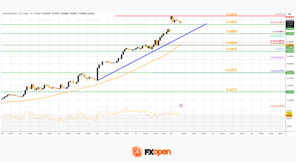 • There is a short-term bullish trend line forming with support at 0.6880 on the hourly chart of AUD/USD at FXOpen.