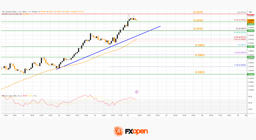 On the hourly chart of NZD/USD on FXOpen, the pair started a fresh increase from 0.5820. The New Zealand Dollar broke the 0.5900 barrier to start the recent rally against the US Dollar.