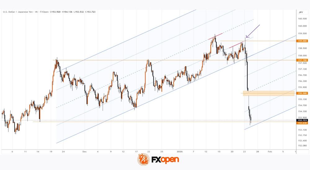 As the USD/JPY chart shows, the exchange rate fell sharply, reaching its lowest level since early November 2025.