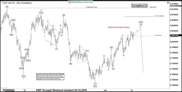The decline in USDCHF from the November 5 peak unfolded in three waves, suggesting that subsequent bounces were likely to fail in either 3, 7, or 11 swings for an extension lower as far as November 25 high remained intacct. The 4‑hour chart from January 18 captures the advance from the December 25 low, which developed in seven swings and was expected to terminate between 0.8020–0.8092 before the downtrend resumed. The 0.81018 level serves as the key invalidation point—holding below this resistance keeps the bearish view intact and reinforces the expectation of further decline.