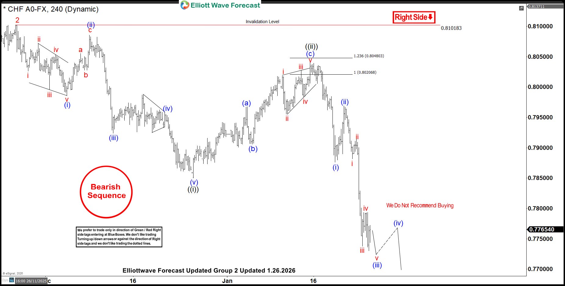 USDCHF Jan 26 4 Hour Elliott Wave ChartUSDCHF found sellers in the 0.8020–0.8092 Fibonacci extension area and resumed its decline. Price has already broken below the September 17 low and is currently unfolding wave ((iii)) of 3 down from the November 5 peak. The pair has reached the 100% Fibonacci extension of wave ((i)) relative to wave ((ii)), but ideally should extend toward 0.7625, which represents the 161.8% extension—a typical level for wave ((iii)) to complete. In the near term, any corrective bounces are expected to fail in 3, 7, or 11 swings, offering traders short‑term selling opportunities for further downside.