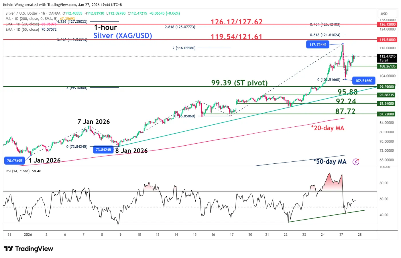 On Monday, 26 January US session, Silver (XAG/USD) soared to a fresh intraday all-time high of US$117.54 before it tumbled swiftly 13% in the next four hours to hit an intraday low of US$102.52 on Tuesday, 27 January Asian session.