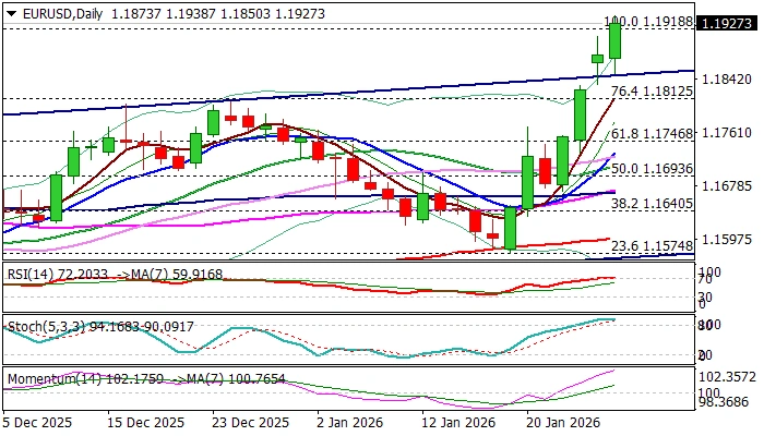 The Euro keeps firm tone and holds near fresh multi-month high (1.1907, posted on Monday) following last week’s strong rally and gap-higher opening at the start of this week.
