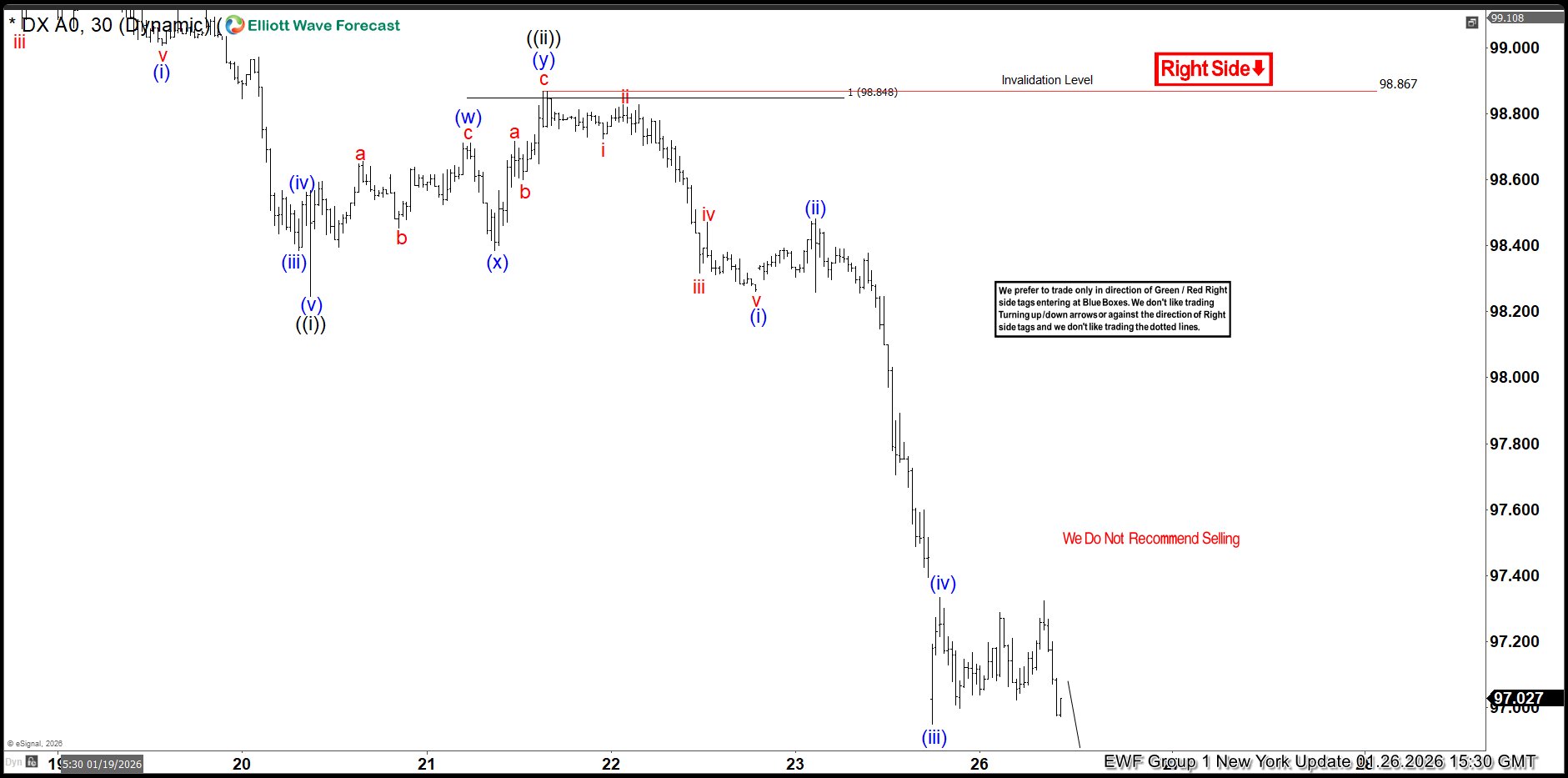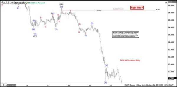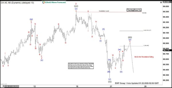 Here’s the 1-hour Elliott wave chart from the 1.22.2026 Asia update. In which, the decline to $98.24 low ended in wave ((i)) as an impulse structure. Up from there, the US dollar made a bounce higher in wave ((ii)) to correct that cycle. The internals of that pullback unfolded as Elliott wave double three structure & managed to reach the extreme equal legs area at $98.84- $99.13. From there, market makers agrees for the minimum reaction lower to take place.