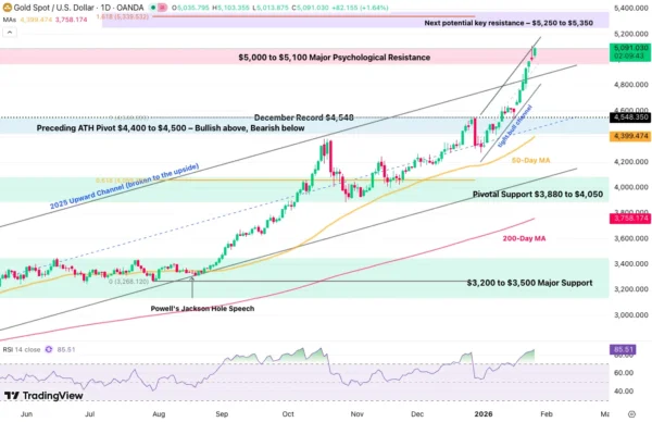 After remaining dormant in the first few trading days of 2026, the Bullion managed a swift push to daily new records, forming a technical Tight Bull Channel.