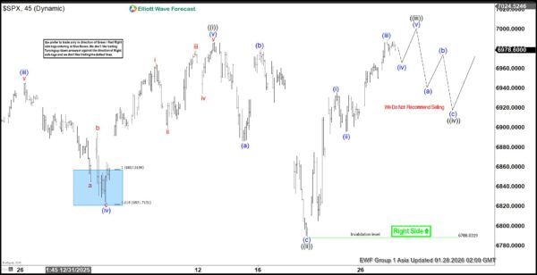 From there, the index resumed higher in wave ((iii)). Wave (i) advanced to 6934.75, while wave (ii) pulled back to 6895.5. Momentum carried wave (iii) to 6988.82. A short-term pullback in wave (iv) is expected, but buyers should return for one more push higher to complete wave (v) of ((iii)). Afterward, the index should correct in wave ((iv)), addressing the cycle from the January 21, 2026 low before resuming its broader rally.