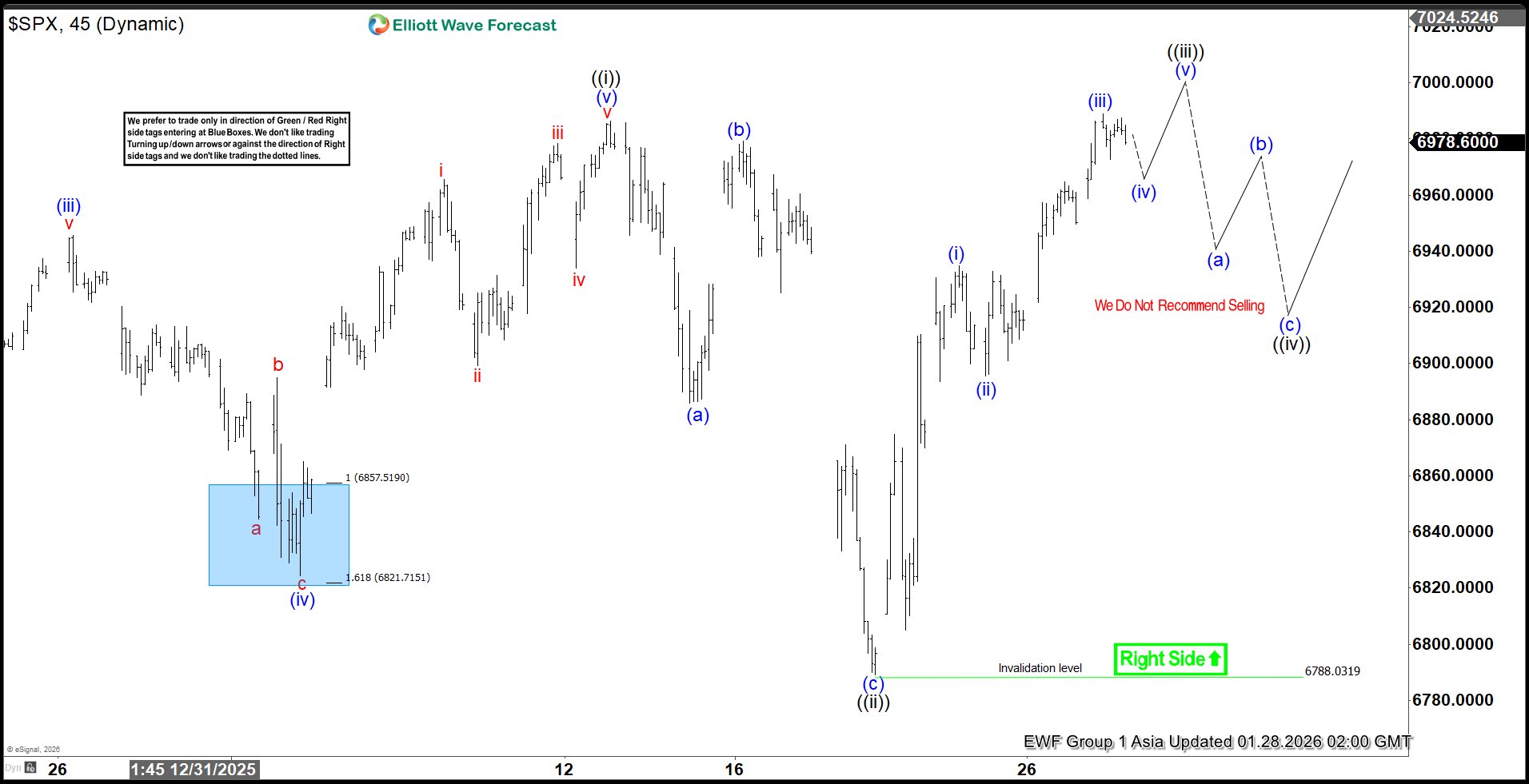 The S&P 500 (SPX) has advanced to a new all-time high, confirming that the bullish sequence from the November 21, 2025 low remains intact. This breakout favors more upside in the near term. The rally from that low is unfolding in a clear five-wave structure, consistent with Elliott Wave analysis. Wave ((i)) ended at 6986.33, marking the first leg of strength. The pullback in wave ((ii)) developed as a zigzag correction. Within this phase, wave (a) ended at 6885.74, wave (b) rallied to 6979.34, and wave (c) declined to 6788.03. This completed wave ((ii)) at a higher degree.