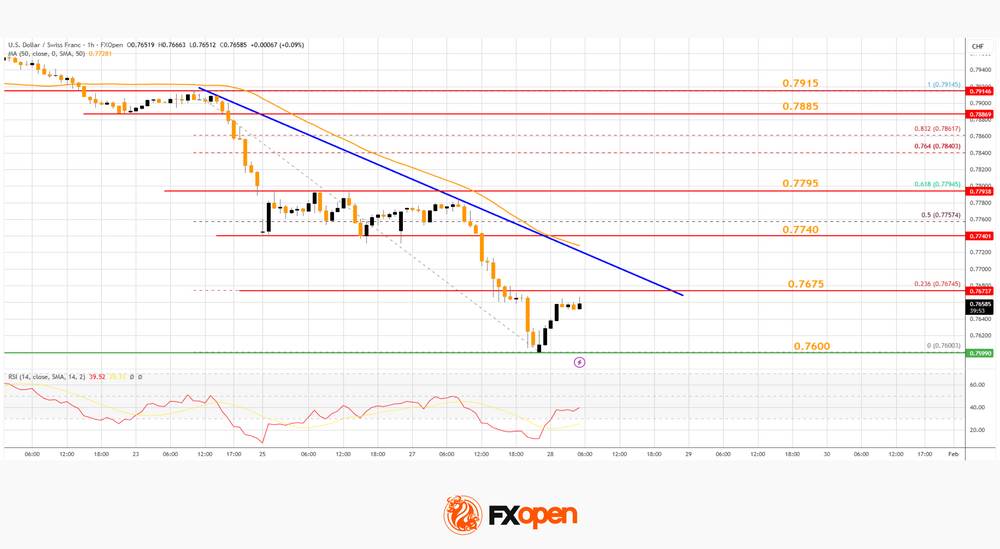 On the hourly chart of USD/CHF at FXOpen, the pair started a fresh decline from well above 0.7880. The US Dollar dropped below 0.7800 to move into a negative zone against the Swiss Franc.