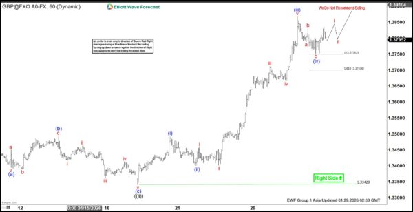 GBPUSD continues to demonstrate a constructive bullish sequence from the November 5, 2026 low, favoring further upside potential. The rally from that low is unfolding in the form of an impulse Elliott Wave structure, which provides clarity on the ongoing trend. From November 5, wave ((i)) concluded at 1.3568, followed by a corrective pullback in wave ((ii)) that ended at 1.334. The internal subdivision of wave ((ii)) developed as a zigzag formation, with wave (a) finishing at 1.339, wave (b) rallying to 1.3495, and wave (c) declining to 1.334. This sequence completed wave ((ii)) at a higher degree and set the stage for renewed strength.