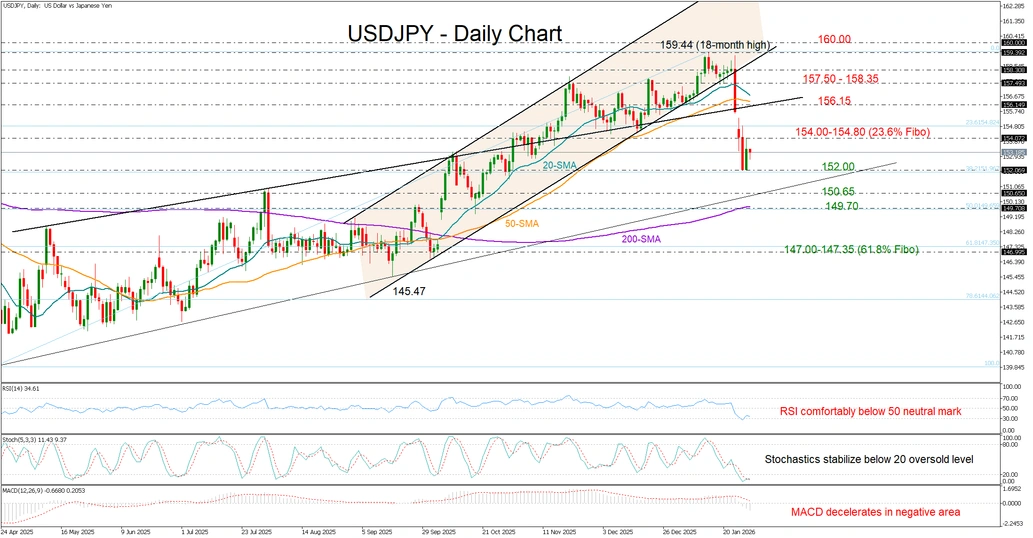 With upside momentum lacking and technical indicators remaining in bearish territory, downside risks appear to outweigh upside potential, keeping the focus on the 152.00 support area. A break below this level could expose the pair to the 150.70 region, where the ascending trendline from April is located. Slightly lower, the 200-day simple moving average (SMA) may attempt to cease the sell-off near the 50% Fibonacci retracement of the April–January upleg around 149.70. Further declines could gather pace towards the 147.00–147.35 area.