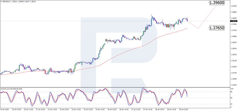 On the H1 chart, the correction from 1.3845 continues, with the next support target around 1.3765. A rebound from this level could drive prices higher, supporting further upward momentum. This is confirmed by the Stochastic oscillator, which shows a decline but remains below the 80.0 mark.