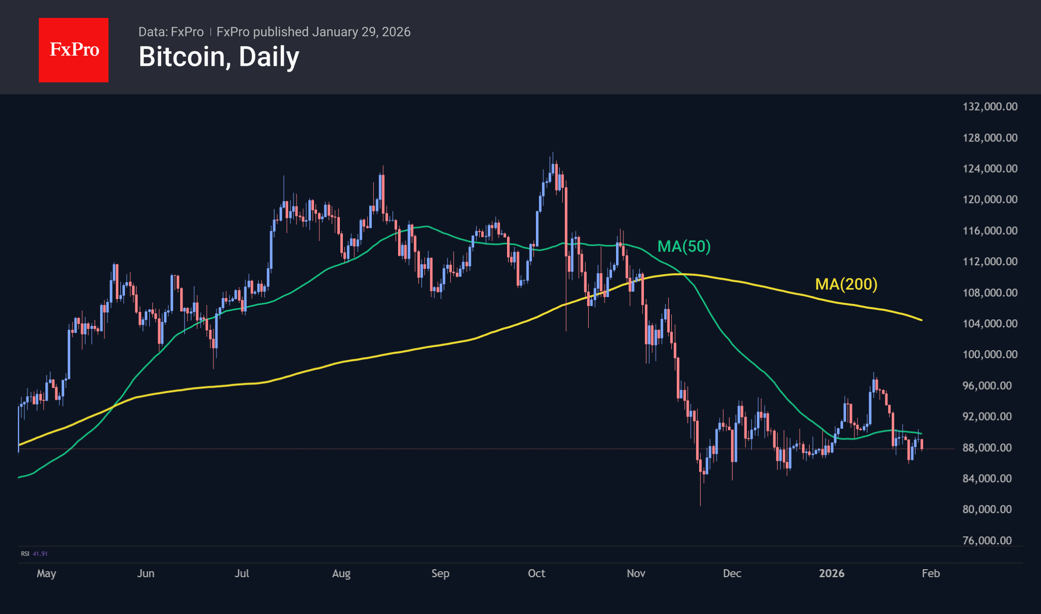 On Wednesday evening, Bitcoin saw another round of sell-offs as the market attempted to break above $90K, failing yet again to return above the 50-day moving average. This curve is gradually turning downwards, further strengthening the bearish arguments. On the other hand, BTC has not yet begun an active decline after consolidation. A formal signal for the start could be a break of support near $85K. An important question is whether a sharp downturn in metals will help cryptocurrencies by restoring interest in them, or whether it will cause even more damage. We lean towards the latter due to the potential for deleveraging, which is dangerous for all risky assets in the early stages. This is a zugzwang situation, where the next move only makes the situation worse.