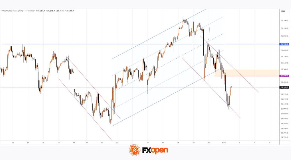 Last week saw the release of quarterly earnings from Microsoft (MSFT), Meta Platforms (META), Tesla (TSLA) and Apple (AAPL). At the opening of Monday’s session — today, 2 February — the Nasdaq 100 index (US Tech 100 mini on FXOpen) opened with a bearish gap, sliding towards the 25,100 level.