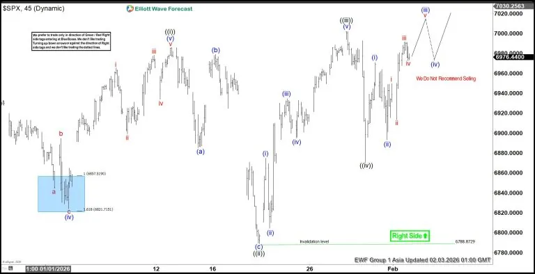 The S&P 500 (SPX) continues to advance as it works toward completing a diagonal Elliott Wave structure that began at the November 21, 2025 low. From that level, wave ((i)) pushed higher and ended at 6986.33. The market then entered wave ((ii)), which unfolded as a clear zigzag. Wave (a) declined to 6885.74, while wave (b) recovered to 6979.34. Wave (c) extended lower and finished at 6788.87, completing wave ((ii)) at a higher degree.