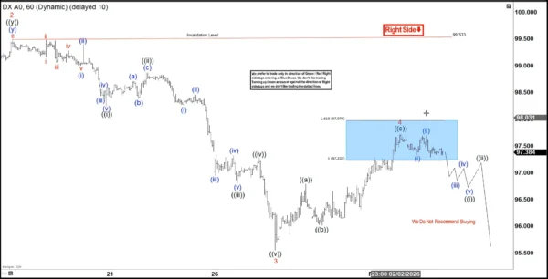 The Dollar Index (DXY) continues to unfold from the September 2022 peak as a five‑wave cycle, with the structure now approaching the conclusion of wave ((5)). Wave ((4)) of this impulse move ended at 100.395 on November 21, 2025, after which the Dollar resumed its decline. The Index currently displays only a clear three‑swing sequence down from the November 21 high, which strongly suggests that the downside remains incomplete. From wave ((4)), wave 1 terminated at 97.75, while wave 2 retraced higher to 99.53, as reflected in the one‑hour chart. The Index then resumed lower in wave 3.