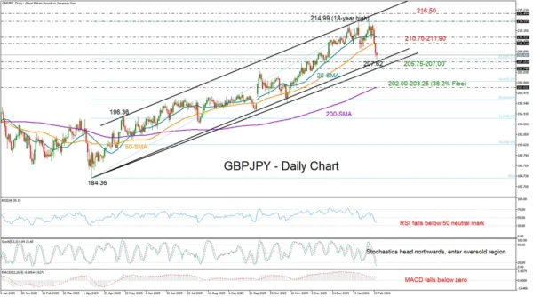 On the upside, if the 207.70 floor holds, the bulls may attempt to reclaim the 50-day SMA around 210.70. Then, a move above the 20-day SMA at 211.90 could strengthen buying interest towards the 18-year high of 214.99 and possibly up to the upper band of the broad bullish channel seen near 216.50.