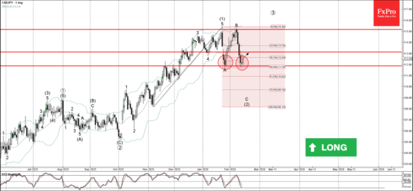 CADJPY currency pair recently reversed up from the support zone between the support level 112.00 (former low of wave A from January), lower daily Bollinger Band and the 50% Fibonacci correction of the upward impulse from November.