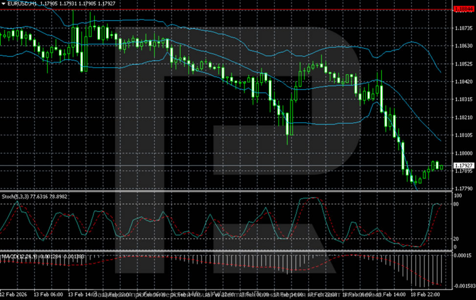 On the lower H1 time frame, a sharp downward move is visible, followed by local stabilisation. The price is forming a small bounce off 1.1780 but remains below the Bollinger Bands’ middle line. The MACD remains negative, although the pressure is gradually decreasing. The Stochastic oscillator is in the overbought zone, suggesting that any corrective rebound could fade in the 1.1820–1.1840 area.