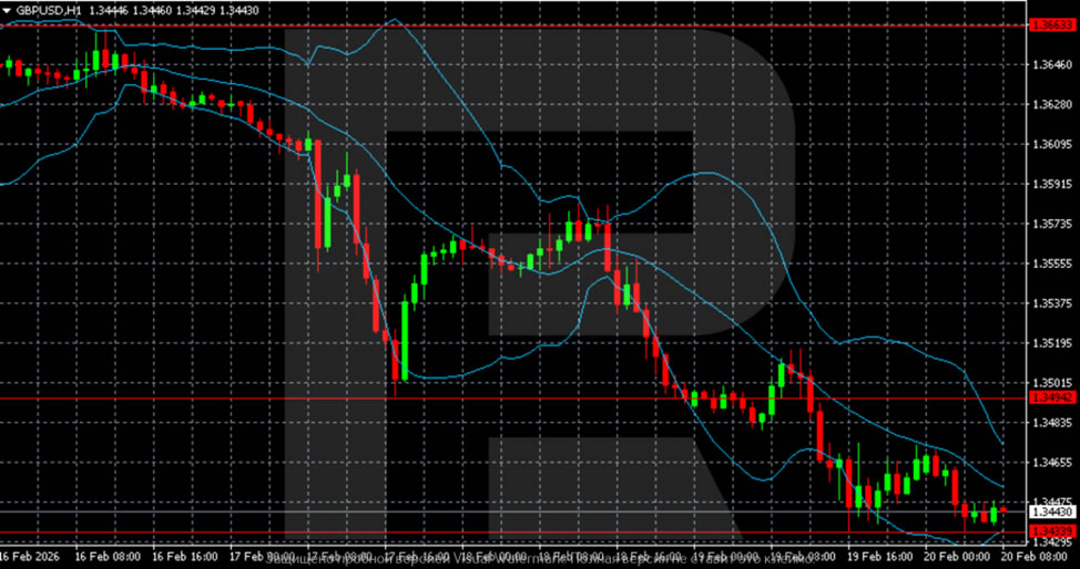 The H1 time frame shows a sharp sell-off on 19 February, followed by narrow consolidation at the lows. The Bollinger Bands have begun to narrow, suggesting volatility is easing after the recent sharp move.