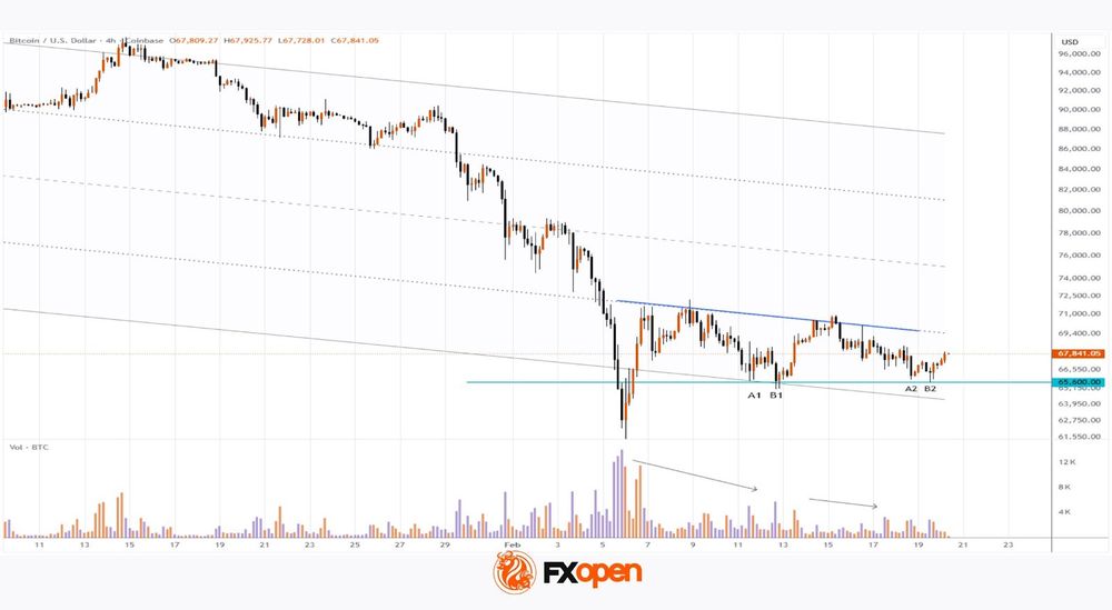 • A double bottom (A1–B1) on 11–12 February, aligning with the lower boundary of the long-term descending channel.