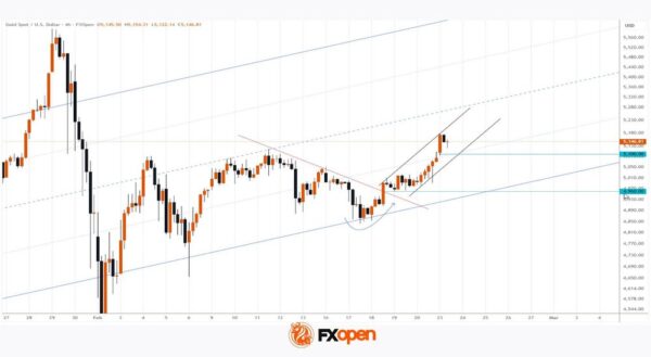 As shown on the XAU/USD chart today, gold climbed above $5,170, reaching its highest level so far this month. The main bullish factors are: