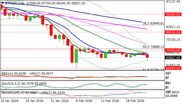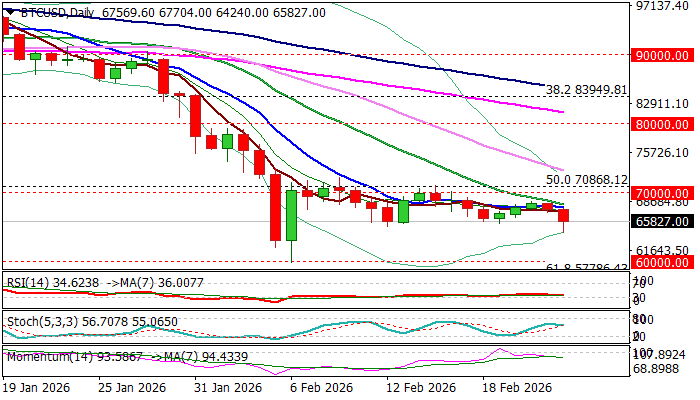 Fresh extension lower cracked important supports at 65.5/65K zone (higher base) but need to register a clear break lower to validate developing negative signal and open way for retest of key 60K support zone (psychological / Feb 6 spike low, the lowest since Oc1 2024).