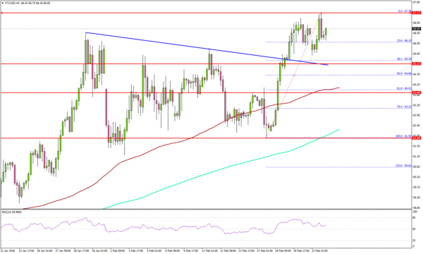 On the downside, the first major support sits near the $65.50 zone. The next support could be $65.00, below which the price could dive and test the 100 simple moving average (red, 4-hour) at $63.95.