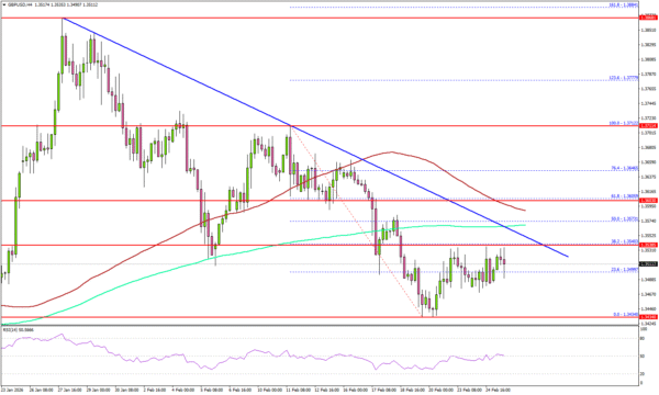 • A key bearish trend line is forming with resistance at 1.3550 on the 4-hour chart.