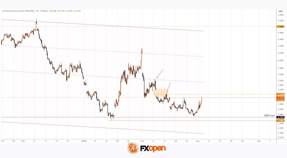 Currently, US natural gas prices are trading near 1.133, where local February highs formed. However, if escalation in the Middle East continues, XNG/USD may rise toward the noted resistance around 3.200.