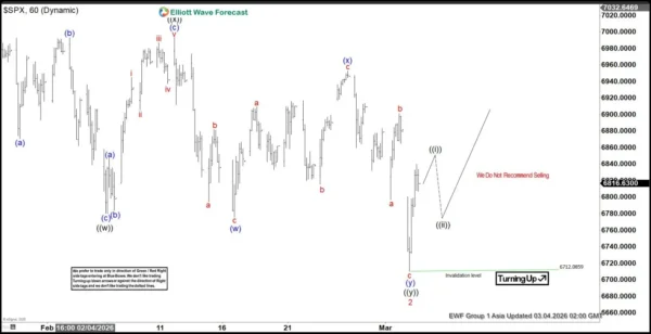 Short-term Elliott Wave analysis indicates that the rally to 7002.28 on January 28, 2026 marked the completion of wave 1. Following this advance, the market entered a corrective phase. The wave 2 pullback recently concluded at 6712, as illustrated in the one-hour chart. This decline corrected the cycle that began from the November 21, 2025 low, and its internal subdivisions unfolded in a double three structure, a common corrective pattern within Elliott Wave theory.