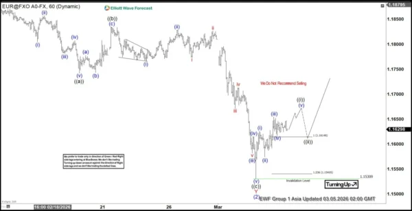 The short-term Elliott Wave outlook for EURUSD indicates that the rally to 1.2083 on January 27 marked the completion of wave (1). Following this peak, the pair entered a corrective phase in wave (2), which unfolded as a double three structure. From the high of wave (1), wave W concluded at 1.1776, while wave X ended at 1.1928. Subsequently, wave Y developed into a zigzag formation. Within this sequence, wave ((a)) finished at 1.1742, and wave ((b)) reached 1.1834, as illustrated clearly in the one-hour chart.