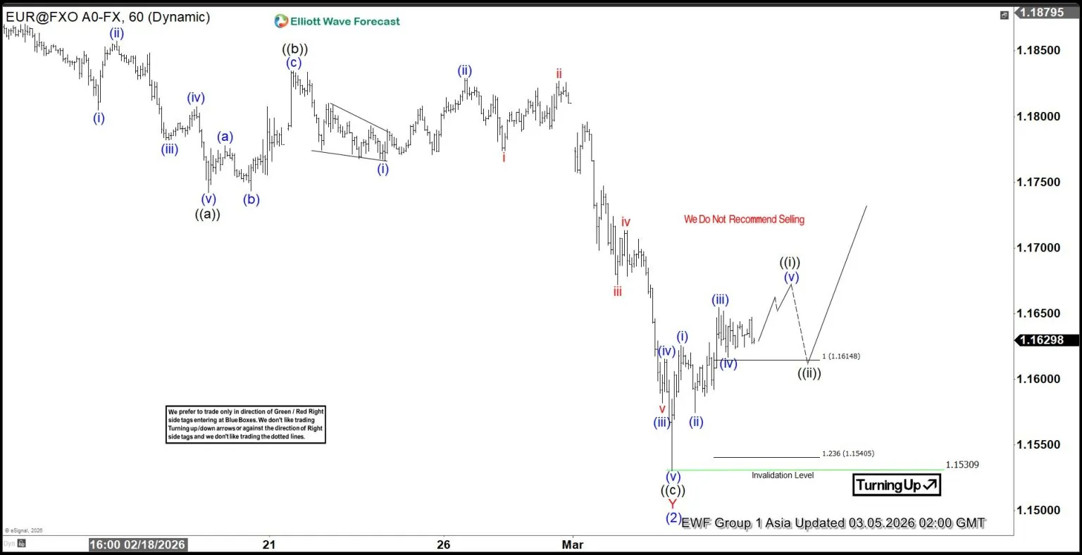 The short-term Elliott Wave outlook for EURUSD indicates that the rally to 1.2083 on January 27 marked the completion of wave (1). Following this peak, the pair entered a corrective phase in wave (2), which unfolded as a double three structure. From the high of wave (1), wave W concluded at 1.1776, while wave X ended at 1.1928. Subsequently, wave Y developed into a zigzag formation. Within this sequence, wave ((a)) finished at 1.1742, and wave ((b)) reached 1.1834, as illustrated clearly in the one-hour chart.