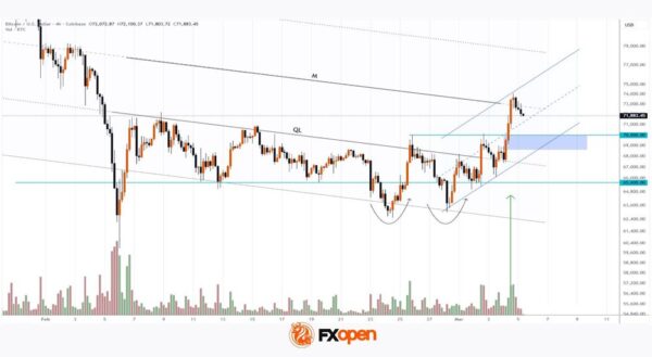 As shown on the chart, the bullish impulse at the start of March led to a breakout above the QL resistance line, as well as the psychological $70,000 level.