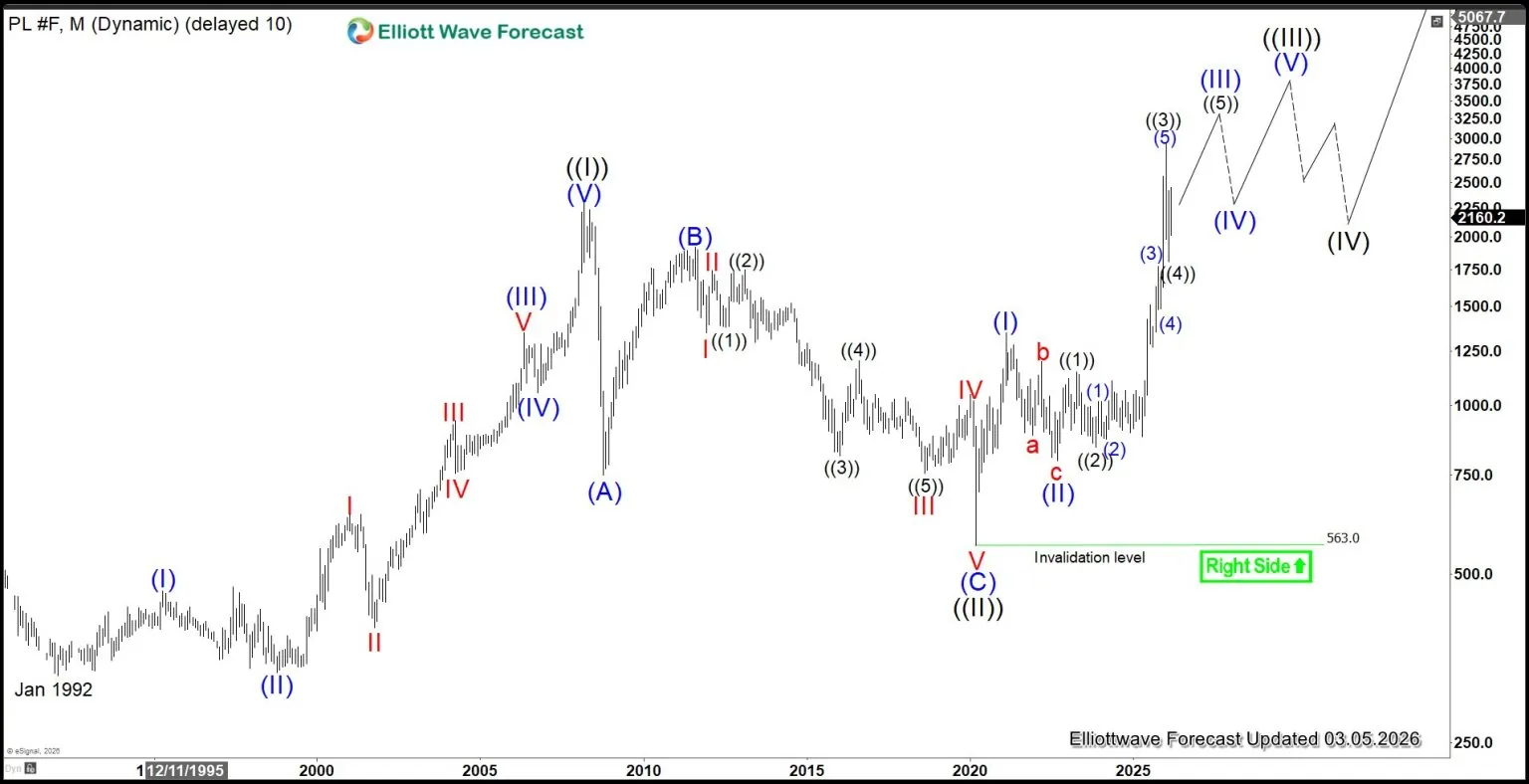 The monthly Platinum chart shows the metal has broken out to new all-time highs, reinforcing a bullish outlook. Platinum remains in a multi-year secular uptrend. The rally from January 1992 to the March 2008 peak completed wave ((I)) at 2308.8. This was followed by a corrective zigzag decline to 563, marking the end of wave ((II)). From that low, the metal resumed higher and has now broken into fresh highs with an impulsive internal structure.