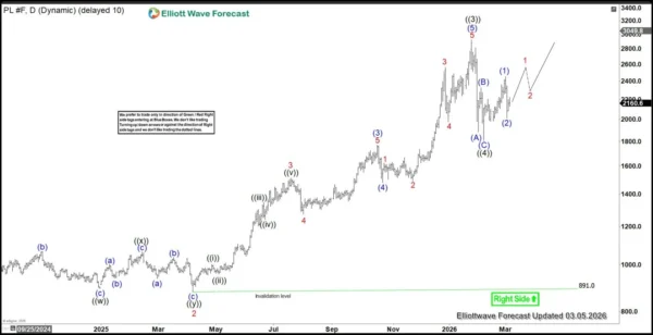 From wave ((II)), wave (I) ended at 1348.2, while the subsequent pullback in wave (II) bottomed at 796.8. Platinum then advanced within wave (III), which is expected to extend one more leg before completion. As long as the metal holds above 563.8, corrective dips should continue to find support in three- or seven-swing structures, setting the stage for further upside.