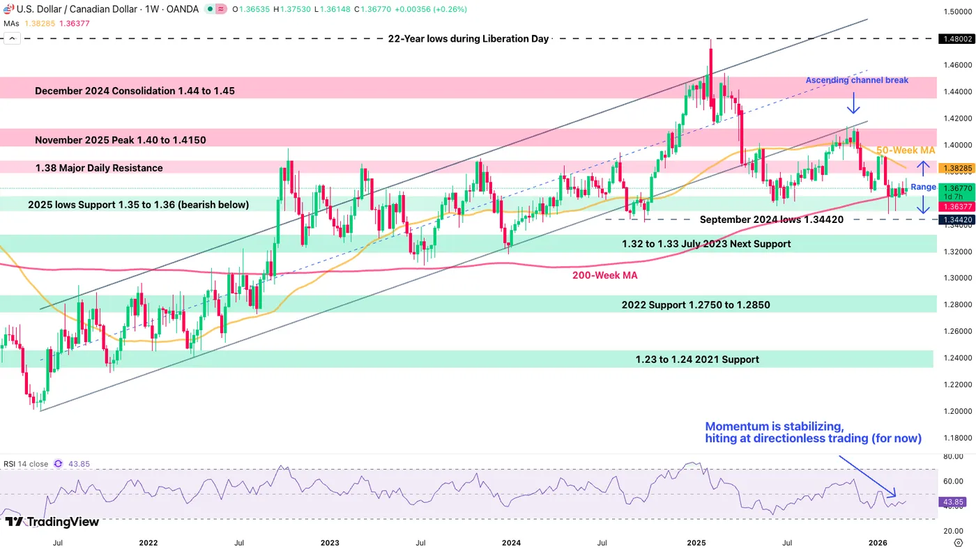 USD/CAD Weekly Chart, March 5, 2026 – Source: TradingView