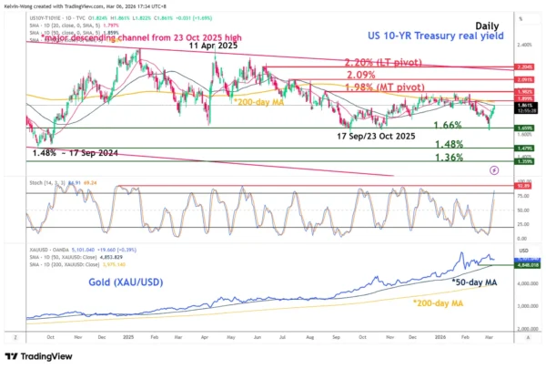 Fig. 2: 10-year US Treasury real yield medium-term trend with Gold (XAU/USD) as of 6 Mar 2026 (Source: TradingView)