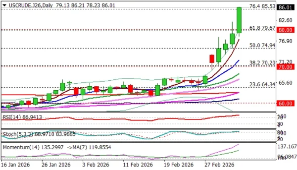 Friday’s strong acceleration surged through round-figure $80 barrier and broke technical resistance at $85.53 (Fibo 76.4% of $95.00/$54.87, 2023/2025 downtrend), violation of which to open way towards Apr 2024 double-top ($87.61) and unmask $90 barrier.