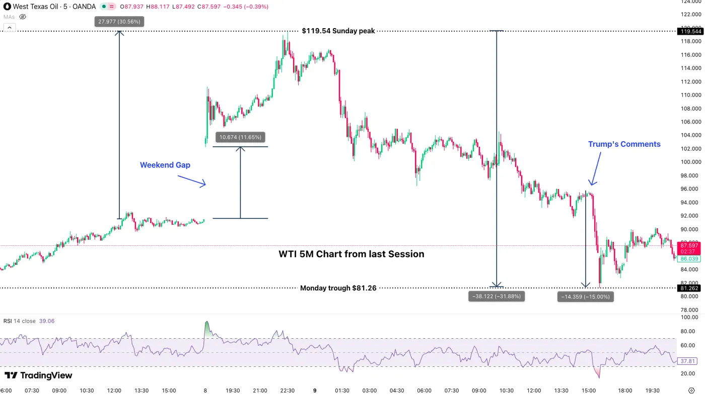 WTI Oil 5M Chart from March 9, 2026. Source: TradingView