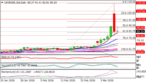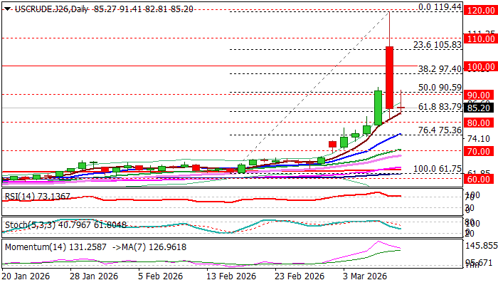 WTI oil extends pullback from Monday’s 3 ½ year high ($119.44) on Tuesday, following unexpected and sharp change in the sentiment after President Trump said that war in the Middle East could end soon.