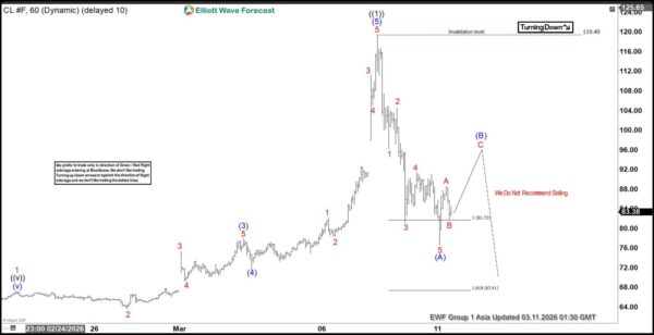 The short-term Elliott Wave outlook in Crude Oil (CL) indicates that the cycle from the December 16, 2025 low has advanced as a five-wave impulse. From that low, wave (1) concluded at $66.48, followed by a corrective pullback in wave (2) which ended at $61.12. The commodity then resumed its upward trajectory in wave (3), reaching $77.98, before another retracement in wave (4) that settled at $71.65. The final leg, wave (5), extended sharply and terminated at $119.40, thereby completing wave ((1)) at a higher degree. With this structure in place, the market has now entered a corrective phase in wave ((2)), designed to retrace the cycle that began in December 2025.
