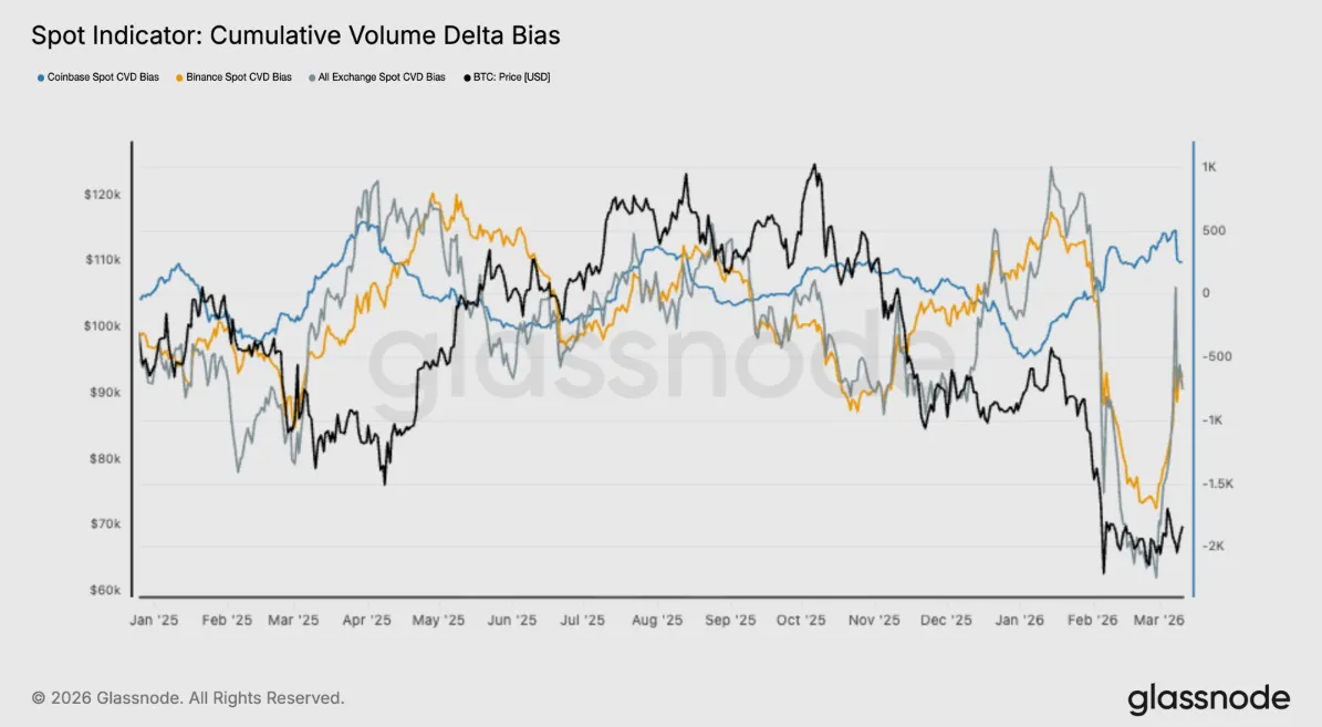 In the broader spot market, demand is showing early signs of recovery, but it remains structurally weak. The Cumulative Volume Delta (CVD), a measure of net buying vs. selling pressure, showed a rebound as buyers began to absorb sell-side liquidity.