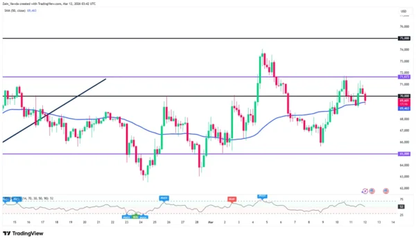 Bitcoin (BTC) is exhibiting a classic transition phase as it navigates between macroeconomic pressure and resilient technical demand. After a brief surge toward the $71,000 mark, the premier cryptocurrency has retreated to consolidate just below the psychologically significant $70,000 level.