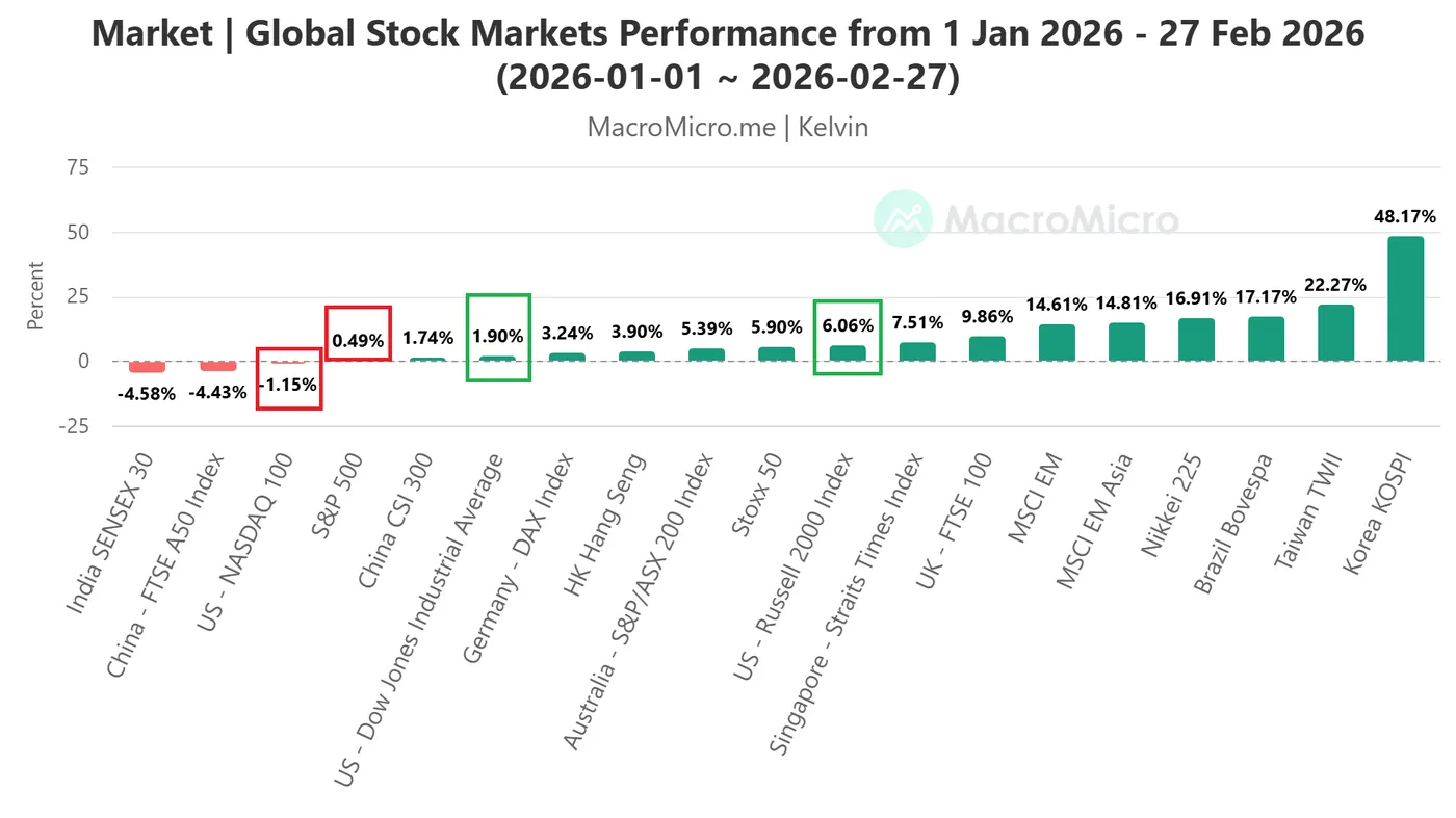 Fig. 1: DJIA & major global stock indices performances from 1 Jan 2026 to 27 Feb 2026 (Source: MacroMicro)