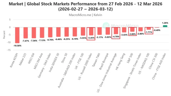 Fig. 2: DJIA & major global stock indices performances from 27 Feb 2026 to 12 Mar 2026 (Source: MacroMicro)